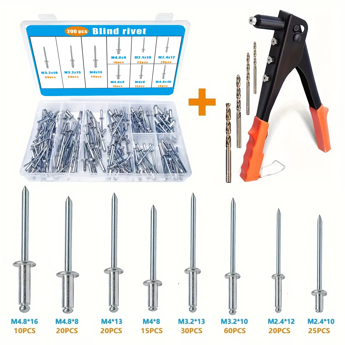 The 200-Piece Aluminum Blind Rivet Kit is a complete solution for fast, reliable fastening. With 8 rivet sizes, a durable rivet pliers tool, and 4 drill bits, this kit makes it easy to handle DIY, automotive, and home repair projects.