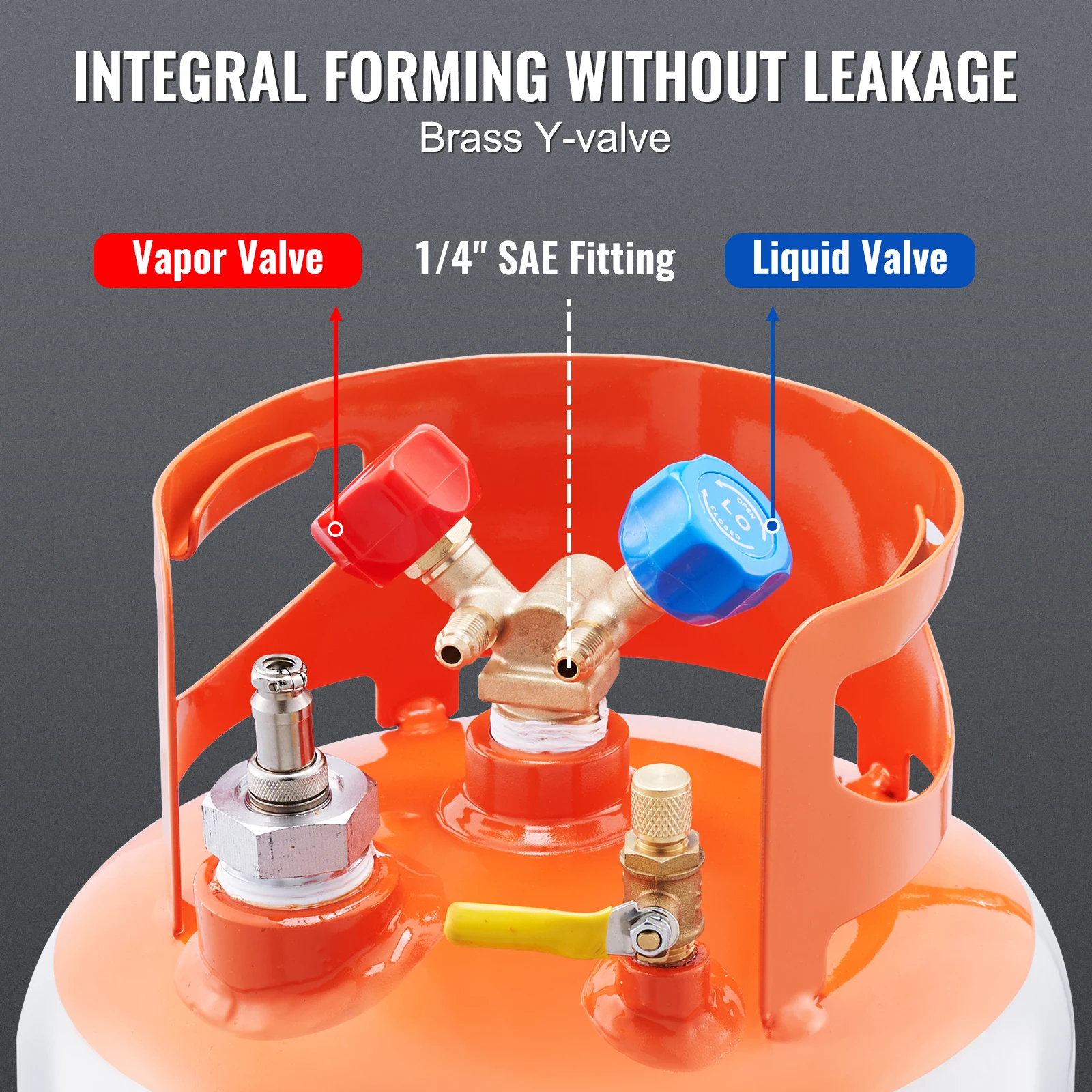 This 30lbs refrigerant recovery tank is equipped with a float switch to prevent overflow, making it ideal for safe and efficient AC refrigerant recovery. Reusable and durable, it works with all types of refrigerants, ensuring reliable performance for HVAC systems and automotive air conditioning maintenance. Compact and easy to handle, this tank is a must-have tool for professional technicians and DIY enthusiasts performing refrigerant recovery and storage tasks.