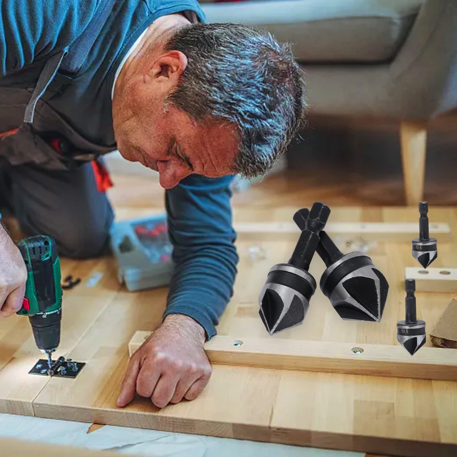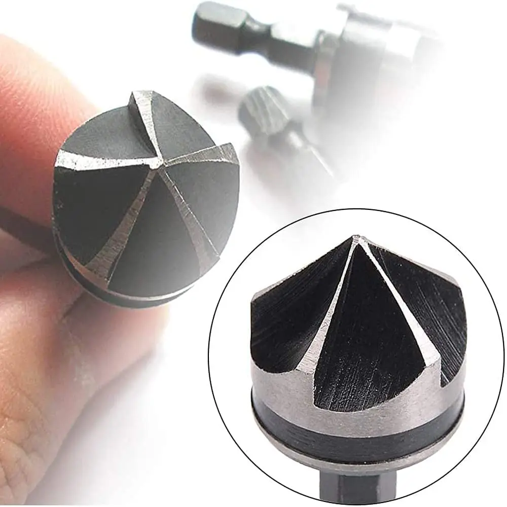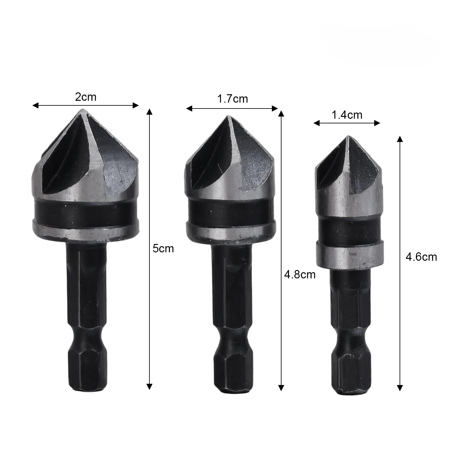 The hexagon shank ensures a secure fit in power tools, reducing slippage during operation. Perfect for woodworking and light metal applications, this chamfer bit set helps create clean tapered edges and flush screw seats, making it an essential addition to any professional or DIY toolkit.